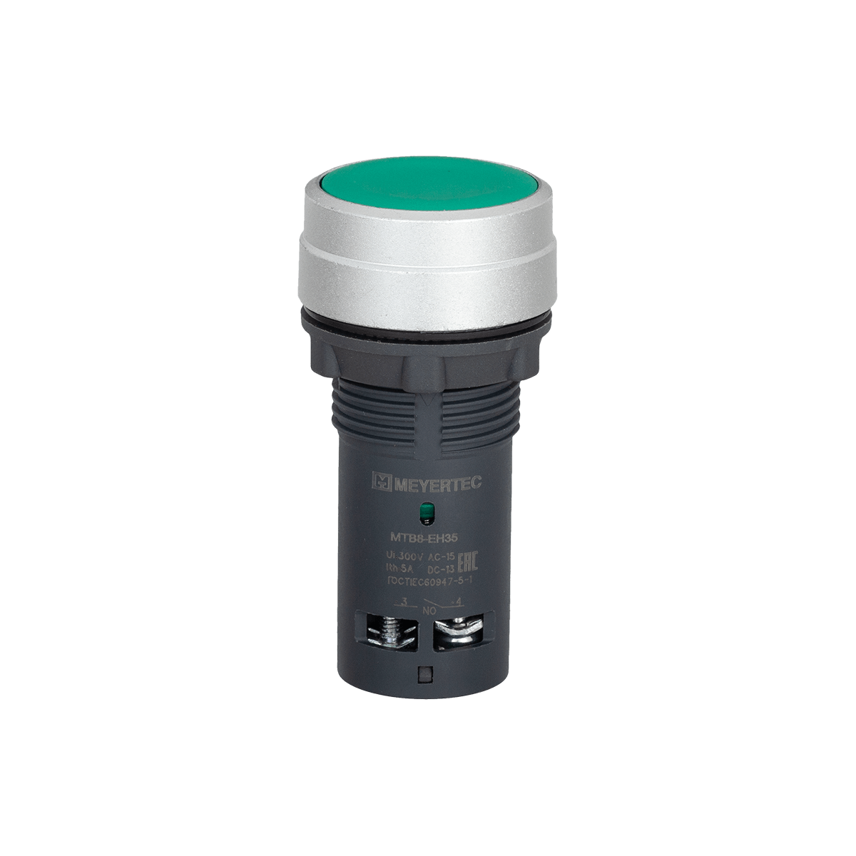 Кнопка плоская зеленая с фиксацией, 1NO+1NC, IP65, пластик MTB8-EH35
