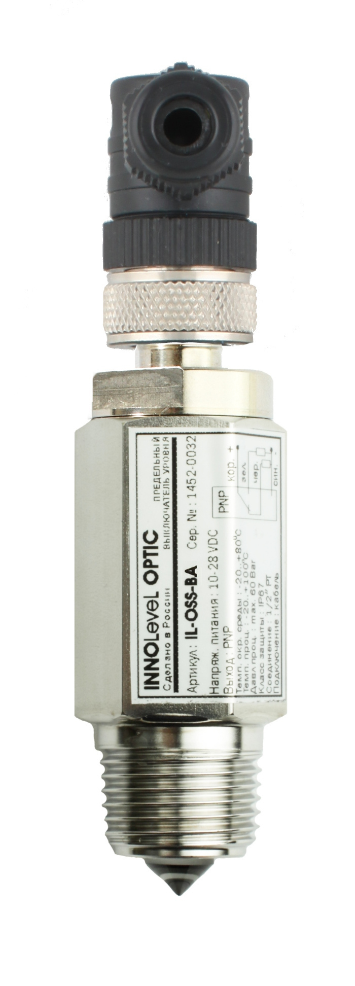 Оптический контактный датчик уровня жидкостей в корпусе из нерж. стали, -20 +100 С, Pmax=60 bar, 10-28 VDC, IP67, соединение- резьба 1/2" PF (цилиндрическая), выход PNP NO+NC, разъем M12x4 pin